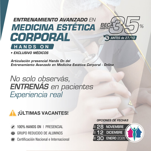 Sede: Modalidad: presencial, 100% hands on, grupo reducido de alumnos. Articulación presencial Hands On de la Especialización en Medicina Estética Facial (online). Dirigido a: exclusivo médicos. Certificación: nacional e internacional. Vacantes: limitadas Ultimos cupos. Becas: 35% hasta el 27/10. Más info